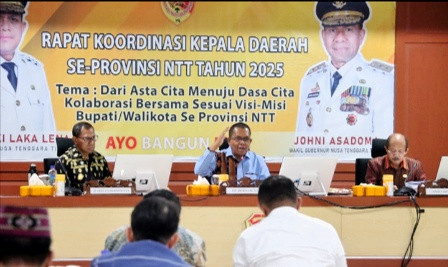 Tatap muka tersebut dilaksanakan dalam acara Rapat Koordinasi bersama Kepala Daerah Tahun 2025 dengan tema ‘Dari Asta Cita Menuju Dasa Cita Kolaborasi Bersama Sesuai Visi Misi Bupati/Walikota Se-NTT’, bertempat di Aula Fernandez Gedung Sasando Kantor Gubernur, Kupang (15/3).