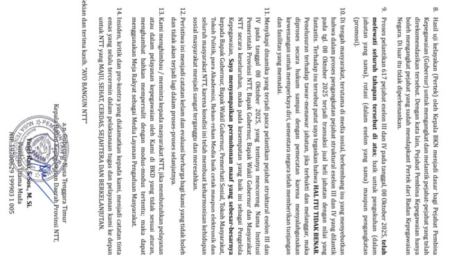 “Maka pada kesempatan yang baik ini sebagai Pengelola Kepegawaian, Saya menyampaikan permohonan maaf yang sebesar-besarnya kepada Bapak Gubernur, Bapak Wakil Gubernur, Pemerhati Sosial, Tokoh Masyarakat, Tokoh Politik, para Akademisi, Rekan-rekan Media baik cetak maupun elektronik dan seluruh masyarakat NTT, karena kondisi ini telah membuat keharmonisan kehidupan sosial masyarakat menjadi sangat terganggu dan meresahkan”, imbuh dia.