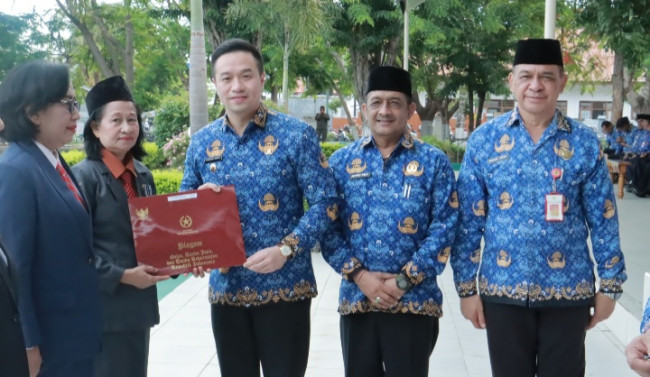 Disaksikan Jefry Pelt (tengah) dan Ignas Lega (kanan) Wali Kota Kupang dr. Christian Widodo menyerahkan Piagam Penghargaan ke sejumlah ASN. Doc. CNC/Prokopim setda kotakpg