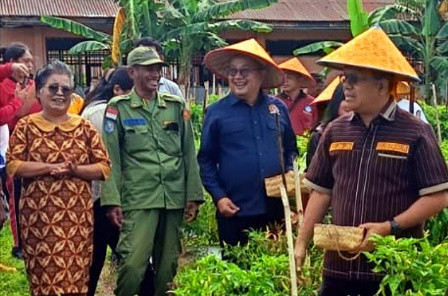 Tampak ceria Gubernur NTT, Melky Laka Lena (kanan) didampingi ADPRD NTT, Winston Rondo (ke-3 dari kanan) saat panen perdana cabe rawit milik SMAN 1 Kupang Timur. Doc. CNc/albert