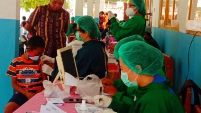 Tampak Kepala SMPN 7 Kupang, RAMLI (baju tenun NTT) memantau kegiatan Vaksinasi pada Kamis, 16…